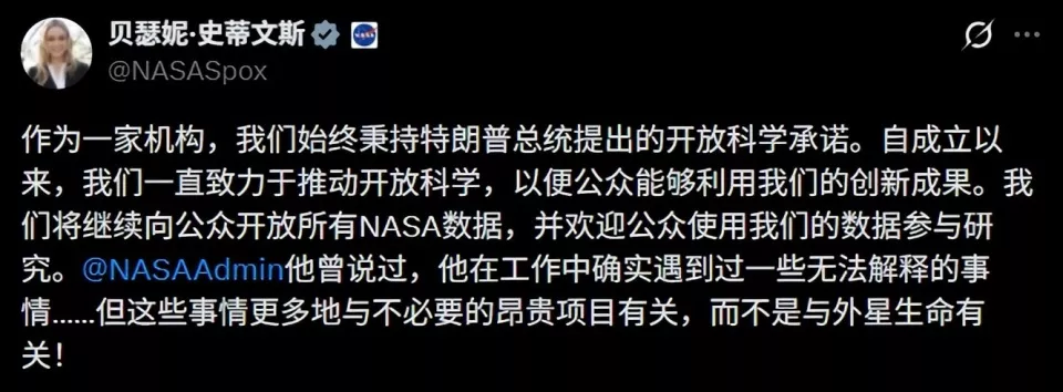 20 日,NASA 发言人贝瑟尼·史蒂文斯(Bethany Stevens)在 X 平台回应称:“我们继续拥护总统在开放科学方面的承诺……我们将继续公开所有 NASA 数据,并欢迎公众使用这些数据参与研究。”她还幽默补充,NASA 遇到的“无法解释的事物”通常是项目严重超支,而非外星生命。