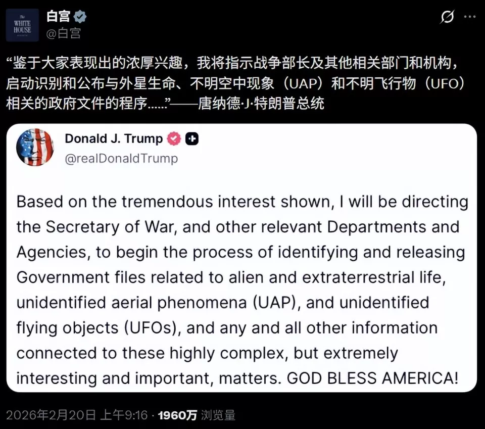 同日,特朗普在 Truth Social 平台正式发帖宣布:“基于公众表现出的巨大兴趣,我将指示国防部长和其他相关部门及机构,全面识别并公开与外星生命、不明空中现象(UAP)、不明飞行物(UFO)以及任何与之相关的所有信息的政府文件。”白宫官方账号随后完整转发了这一声明。