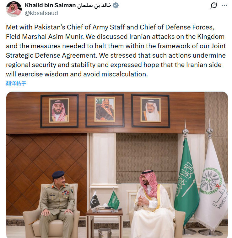 局势瞬间再度紧张起来。数小时后,巴基斯坦陆军元帅穆尼尔抵达利雅得,与沙特国防大臣萨勒曼举行会晤。萨勒曼随后在声明中强调,双方在巴沙共同防御协定框架下,讨论了伊朗对沙特的持续袭击,以及制止袭击的必要措施。