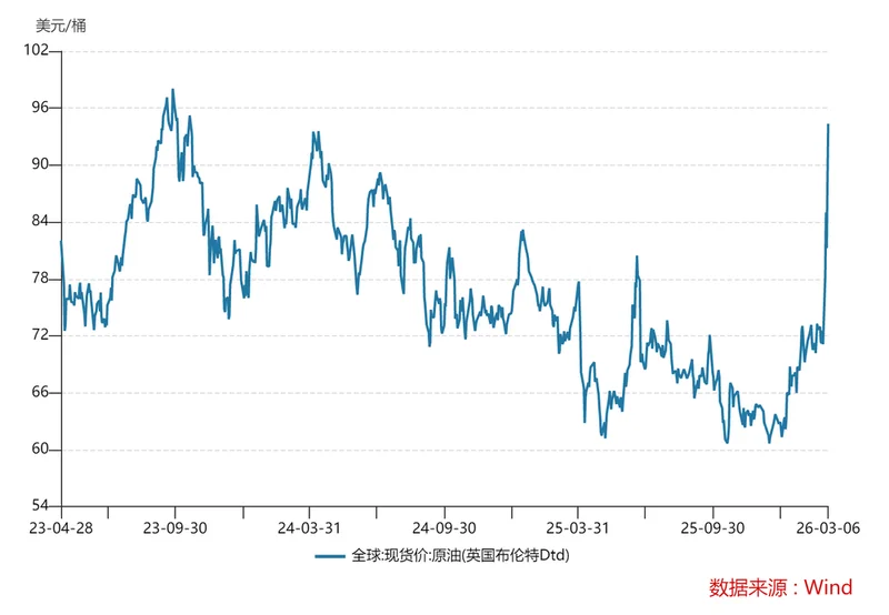 2026年3月6日,原油(英国布伦特Dtd)价格上涨至94.35美元/桶,逼近前期高点。最直接的催化就是中东战火再起,作为全球能源运输体系中核心咽喉通道的霍尔木兹海峡被封航,甚至伊拉克和科威特受出口限制,被迫减产。