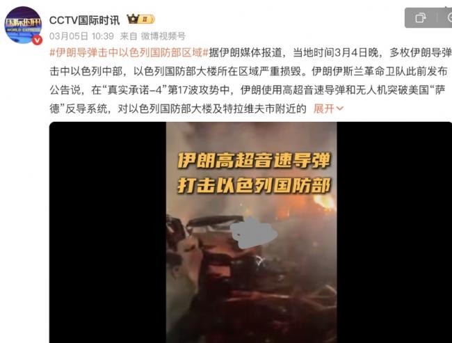 中共央视及多家官媒援引伊朗媒体的报道,声称当地时间3月4日晚,多枚伊朗导弹击中以色列中部,以色列国防部大楼所在区域严重损毁。报道还配以所谓的视频和图片。