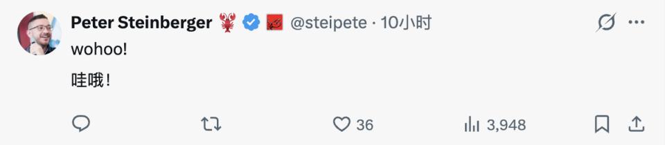 有意思的是,同样刚加入 OpenAI 的龙虾之父 Peter Steinberger,也跑到评论区凑热度,主打一个新同事贴贴。