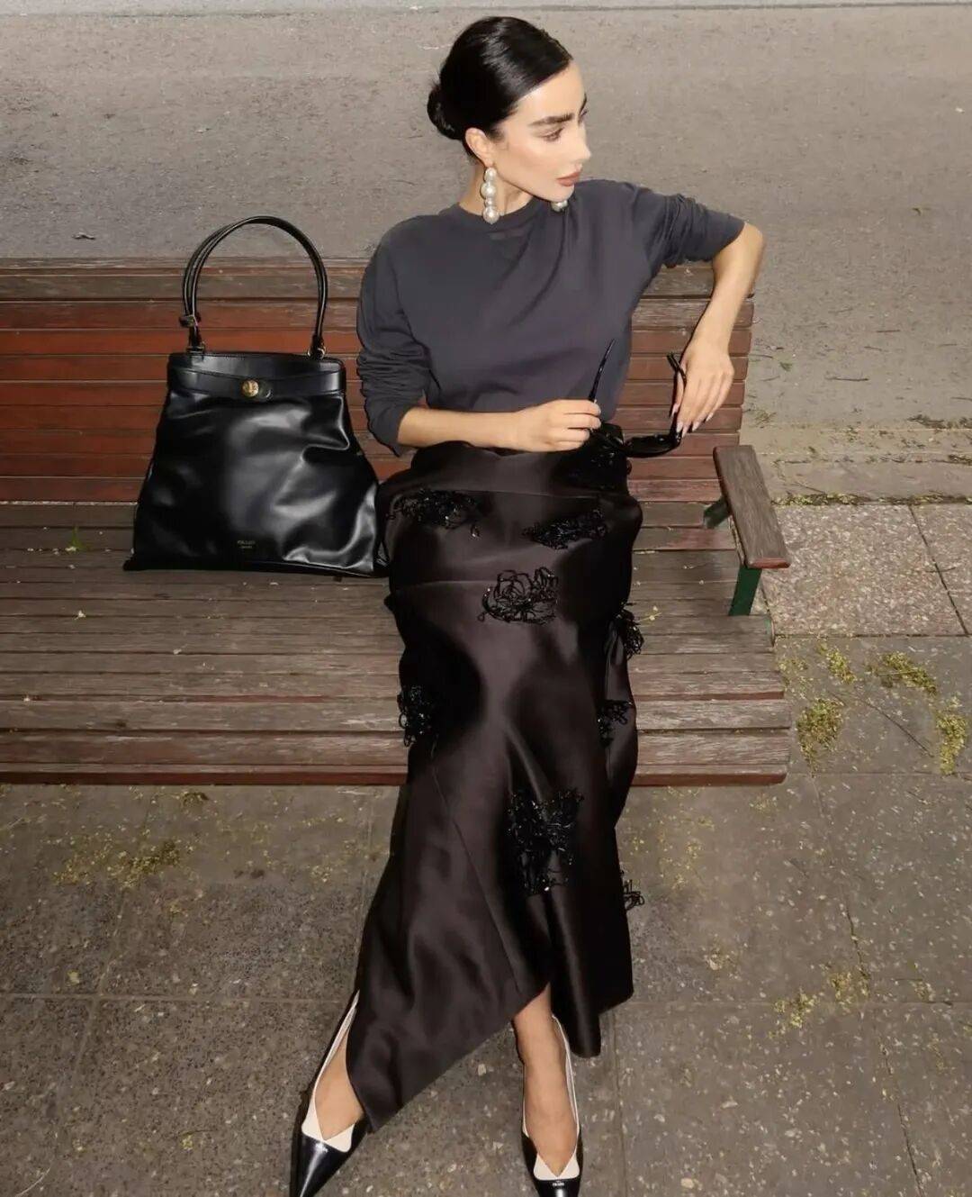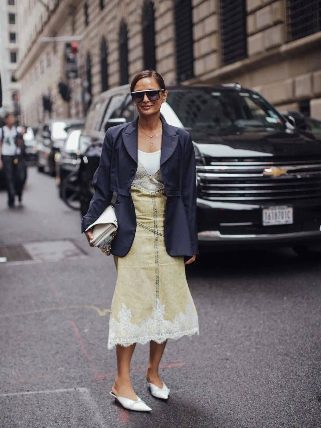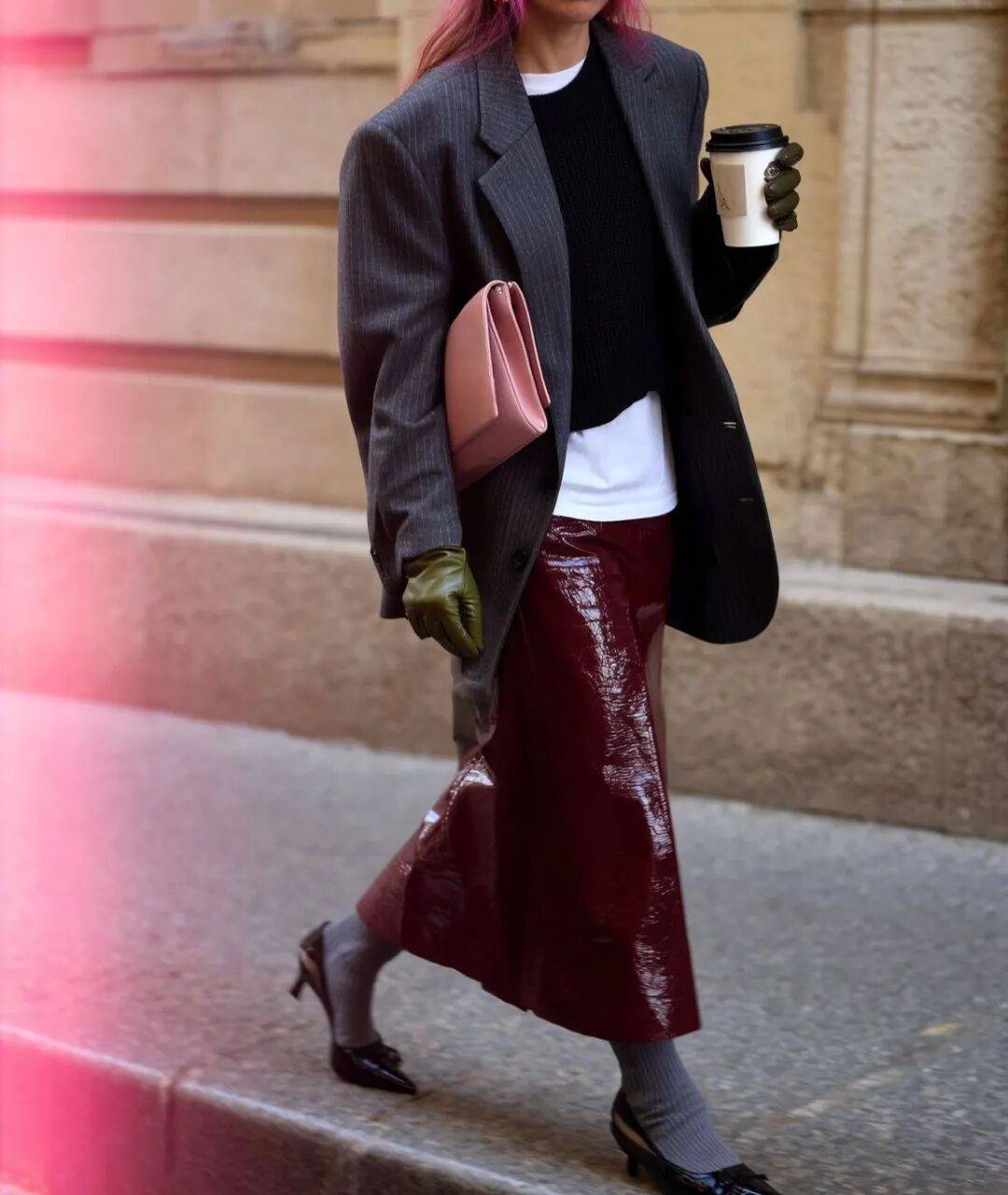 而换成线条利落的直筒裙或西装裙,尖头鞋便展现出干练的一面,整个人看起来修长挺拔,气场自然形成。