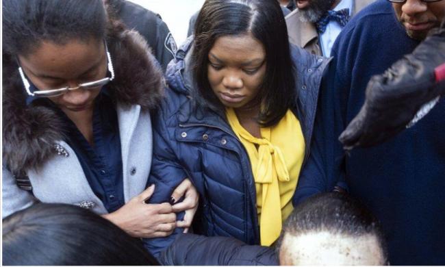 在艾普斯坦死亡当晚负责监看他的联邦监狱警卫诺埃尔(中),2019年11月25日离开纽约联邦法院。(美联社资料照)