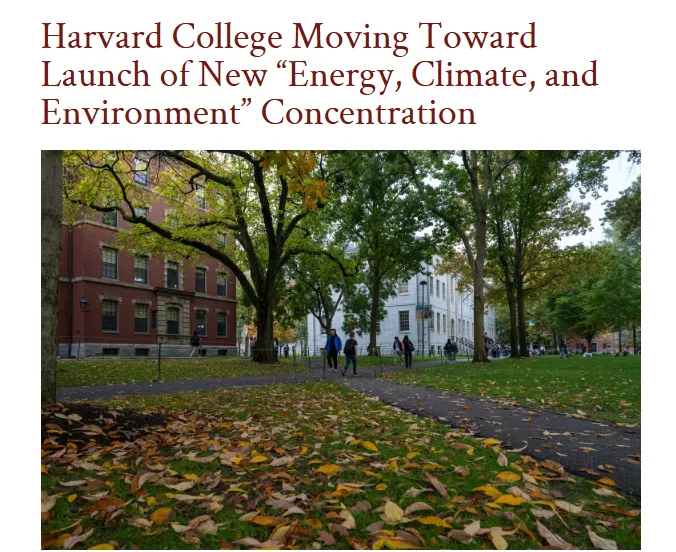 近日,哈佛大学扔出一枚重磅炸弹,官宣将在2026-2027学年推出全新的跨学科本科专业——能源、气候与环境(ENCE)。