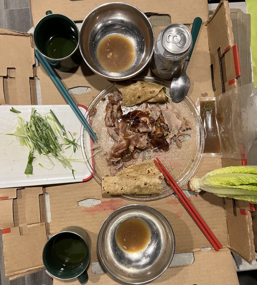 8 老公吃啥,他的滑伴朋友前2天回家一趟,带回不少好吃的,这是带来的烤鸭,2人吃得很开心!