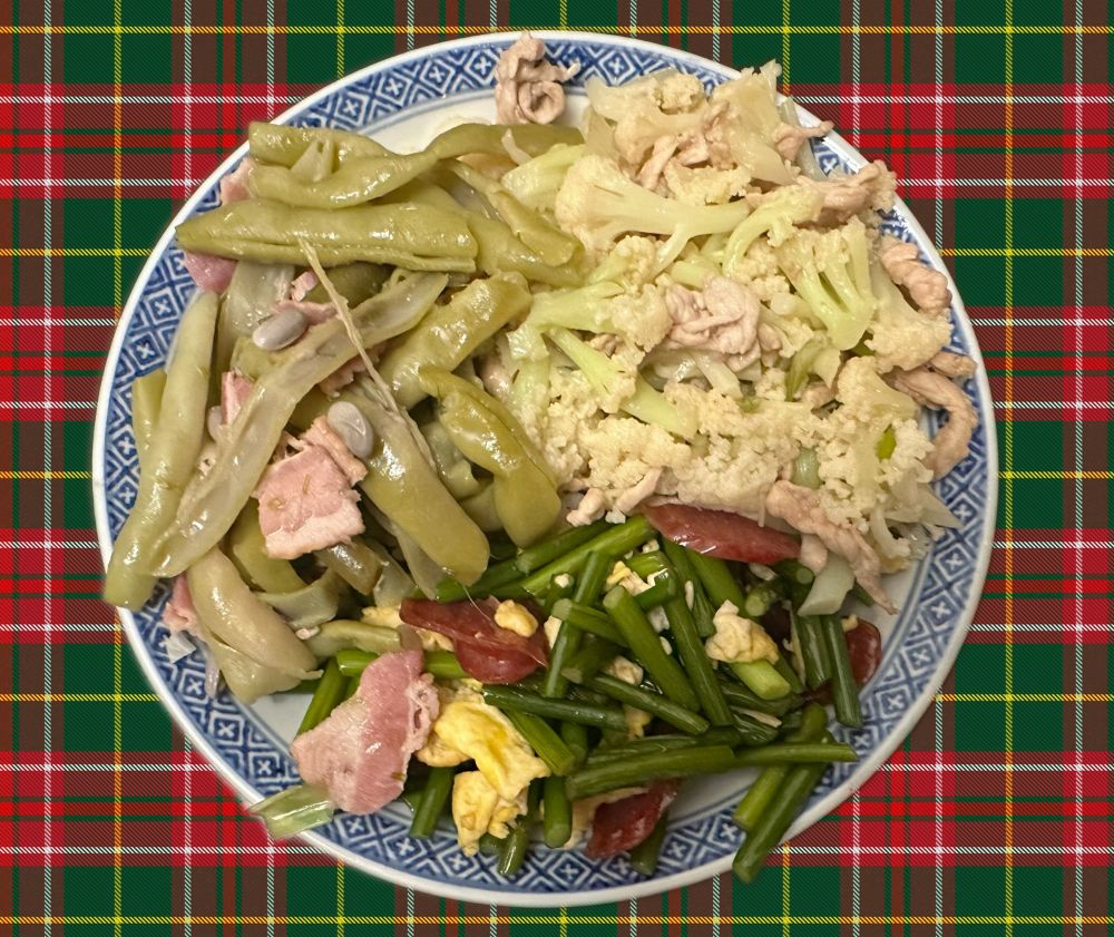 7 昨晚是周五,按惯例做4个菜装盒给儿子家送去,不过先给自己留足,培根炖自产冻豆角,肉丝炒菜花,腊肉鸡蛋炒蒜苔,另一个菜是预制菜梅菜扣肉,得在儿子家蒸了扣盘再浇汁,忘拍了。