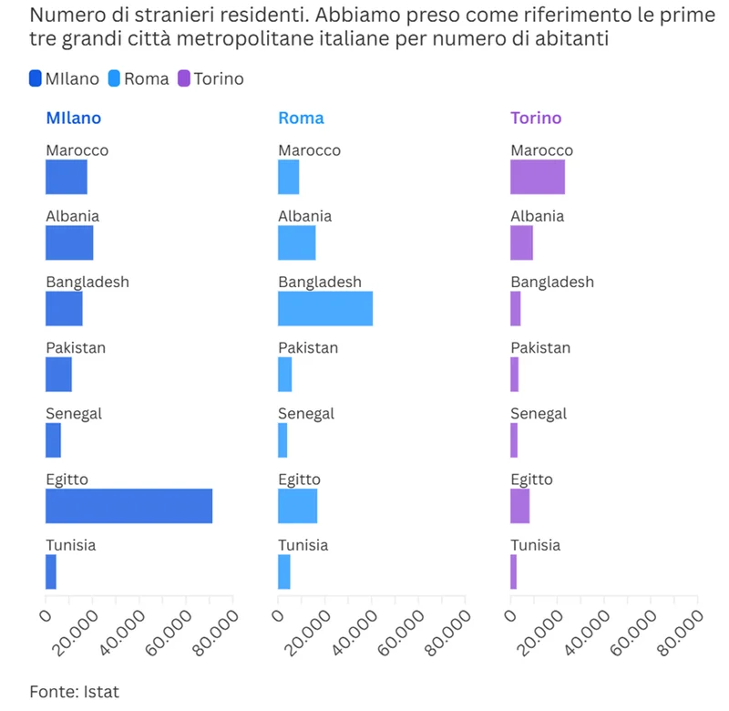 相比之下,大城市中的穆斯林社区结构更为多元,并且因城市而异。例如,在米兰地区,以埃及裔居民为主;在罗马,孟加拉裔群体居多;而在都灵,则以摩洛哥裔居民占多数。
