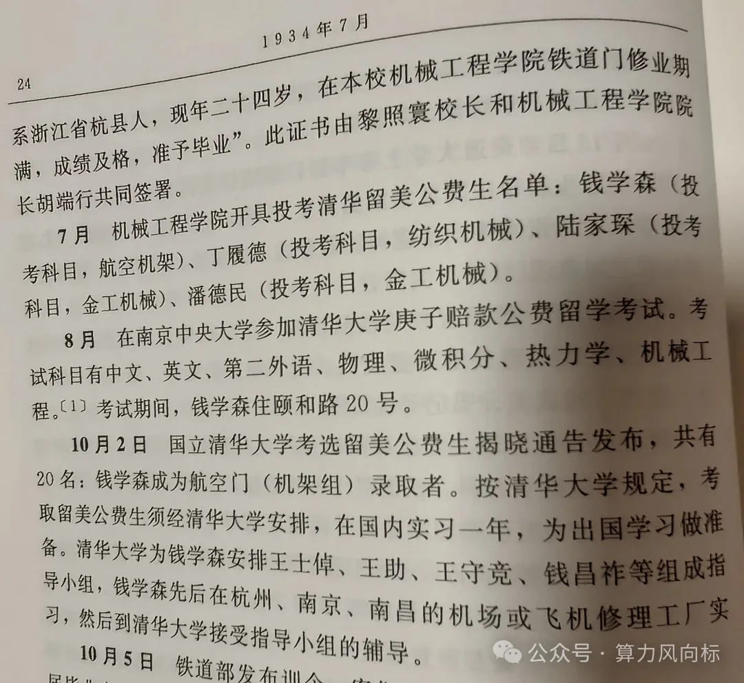 1934年8月,钱学森在南京中央大学参加清华大学庚子赔款公费留学考试。考试科目有中文、英文、第二外语、物理、微积分、热力学、机械工程。〔1]