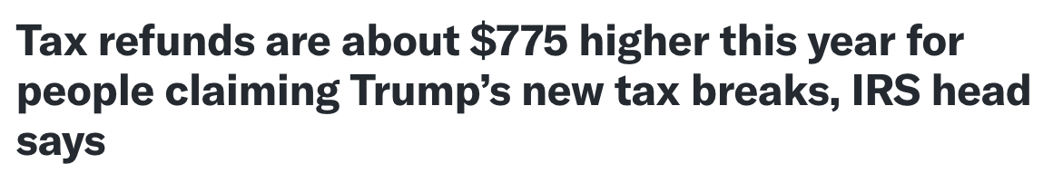 白宫此前曾承诺今年将出现“巨额(HUGE)”退税,部分预测甚至认为会比去年高出1000美元。