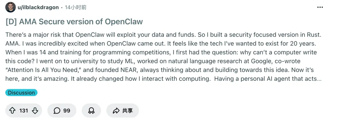 今天,Illia Polosukhin 在 Reddit 上发了一则帖子,深谈了其使用 Rust 来构建安全版 OpenClaw 的心路历程,引起了热议。