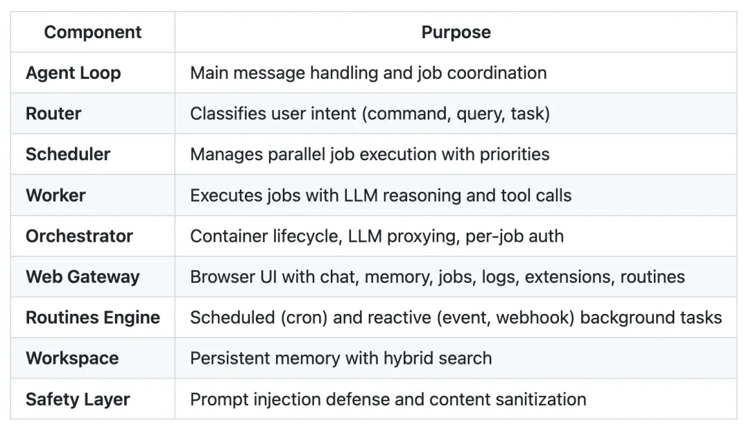 核心组件包括如下:Agent Loop 智能体主循环,负责整体任务调度;Router 用户意图路由层;Scheduler 并行任务调度器;Worker 执行单元(调用模型与工具完成任务);Orchestrator 运行编排层(容器、权限、LLM 调用);Web GatewayWeb 交互入口;Routines Engine 自动化任务引擎;Workspace 长期记忆与检索层;Safety Layer 安全防护层。