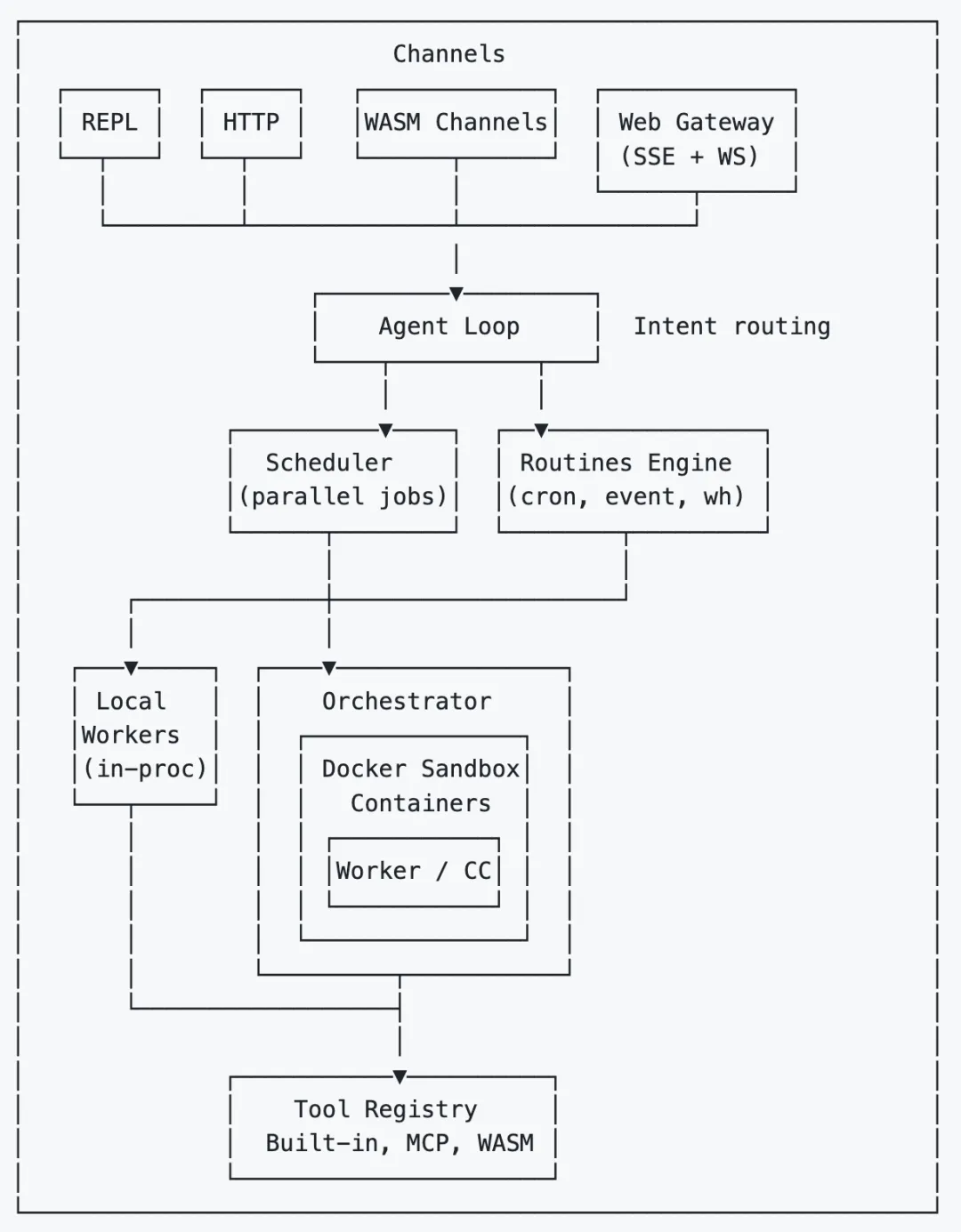 它是一个面向 AI 智能体的开源运行时环境,从设计之初就以安全为核心,并使用 Rust 编写。代码清晰、可审计,也适合企业环境使用。和 OpenClaw 一样,它可以随着时间不断学习,并扩展你能够让它完成的事情。如下为 IronClaw 的架构图: