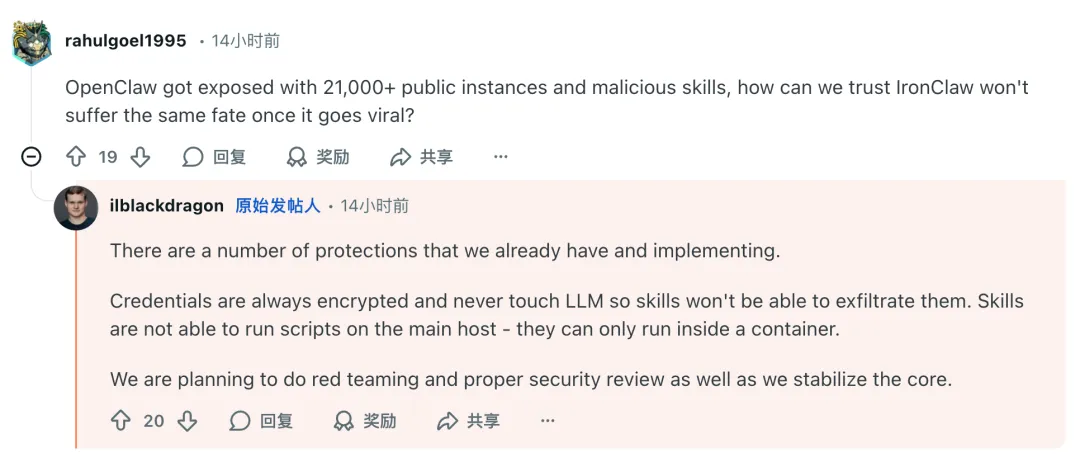 在评论区,Illia Polosukhin 回复了网友关于 IronClaw 的更多问题,比如「OpenClaw 被曝光有 2.1 万多个公开实例,还有恶意 skills。一旦 IronClaw 走红,怎么能保证它不会遭遇同样的命运?」