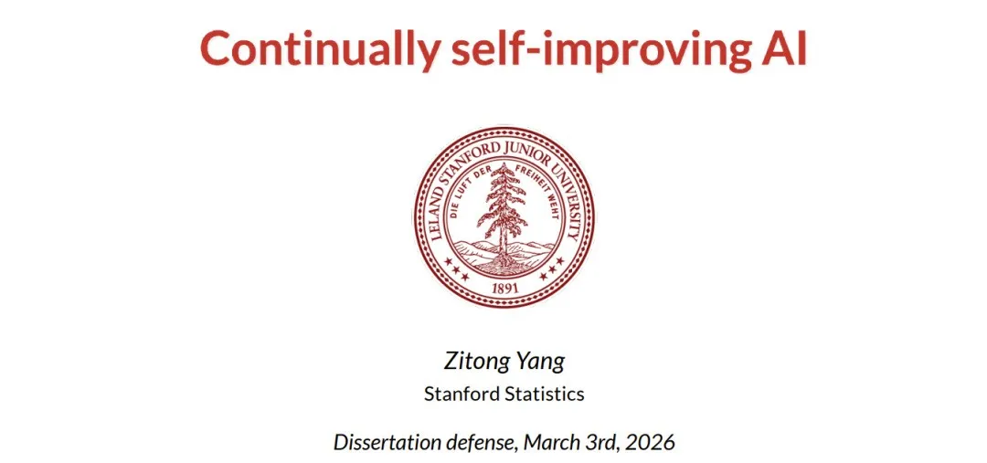 昨天,Thinking Maching Lab 研究者、斯坦福大学博士生 Zitong Yang 正式完成了他的博士论文答辩,课题为「持续自我提升式 AI」(Continually self-improving AI),并且他在答辩完成后很快就放出了自己的答辩视频,从中我们可以看到他对未来 AI 发展路径的系统性探索。针对当前模型在训练后权重静态化、高质量人类数据面临枯竭,以及新算法发现高度依赖人力这三大局限,他提出了明确的解决方案。