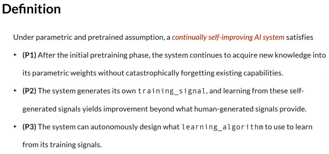 在这两个假设下,持续自我改进式 AI 应该具备三个特性: