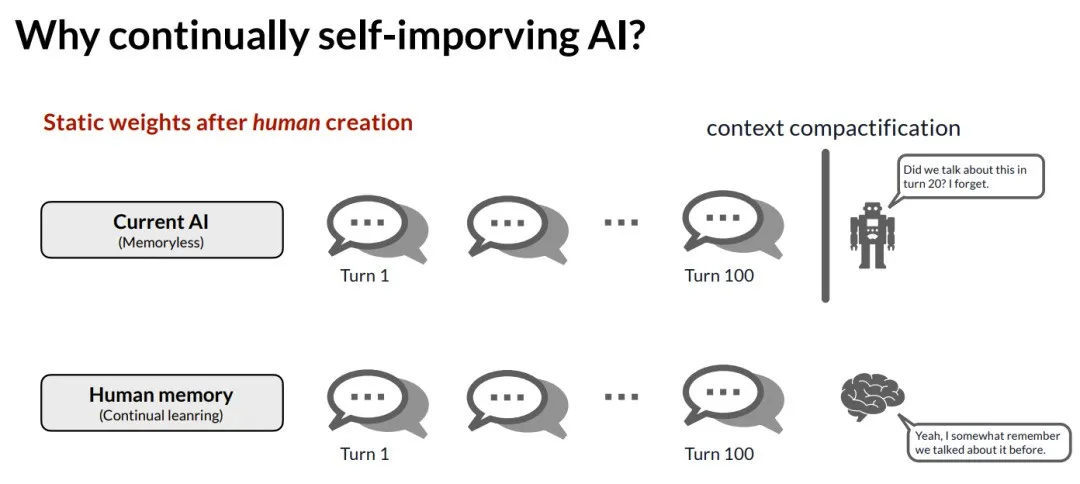 在与 ChatGPT 或 Claude 的典型对话中,一开始你可能有 100 轮对话,然后你会经历一个上下文压缩阶段,试图总结到目前为止的对话。在这之后,如果你试图问 AI 之前发生过什么,它不会有完美的记忆,因为随着上下文变长,压缩是一个非常容易丢失信息的有损过程。但对于人类记忆来说,也许你在前 100 轮对话后睡了一觉,你的记忆转移到了大脑的其他部分,然后你还能隐约记得你之前谈论过的一些事情。