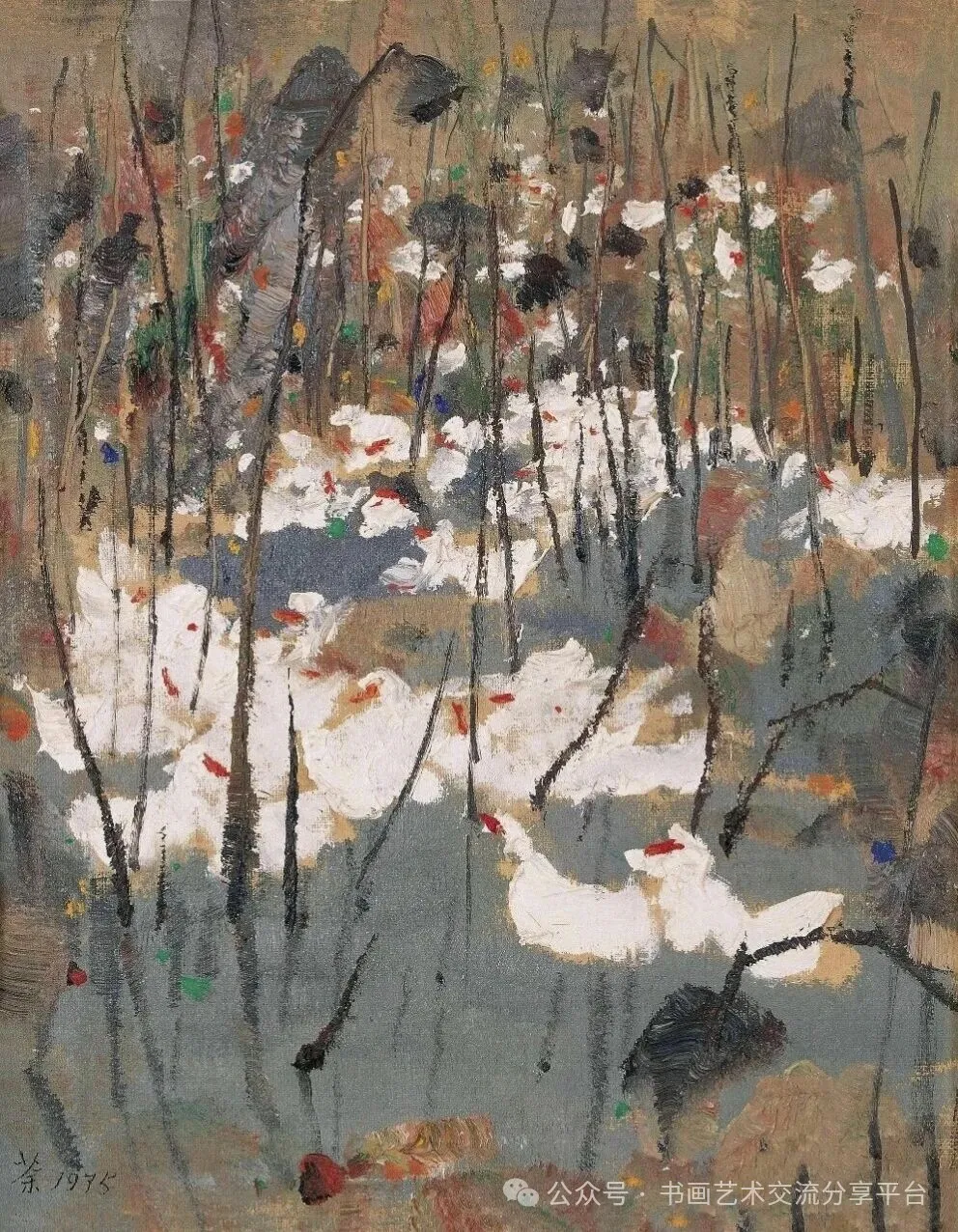 下图是吴冠中先生创作于1975年的木板油画《荷塘》(也被称为《残荷鹅群》)