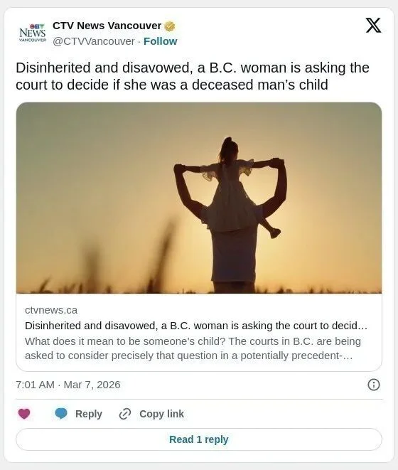 在一宗可能具有先例意义的遗产案件中,BC省法院正被要求回答一个关键问题:在法律上,究竟怎么样才算是“孩子”。