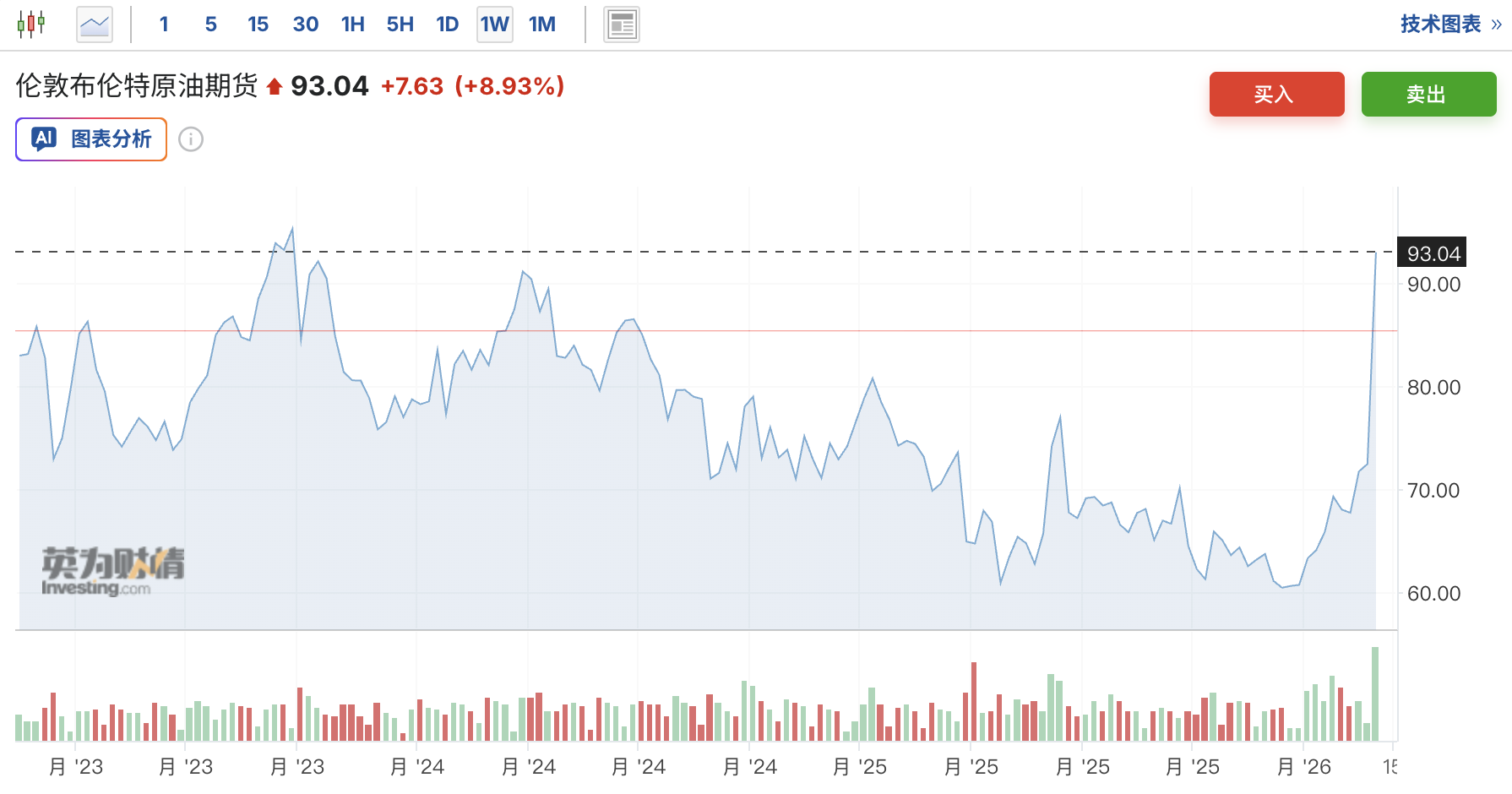 布伦特原油本周收于每桶93美元,单周涨幅达28%,创2023年以来新高;美国基准西德克萨斯中质油则暴涨36%至每桶91美元,创1983年以来最大单周涨幅。