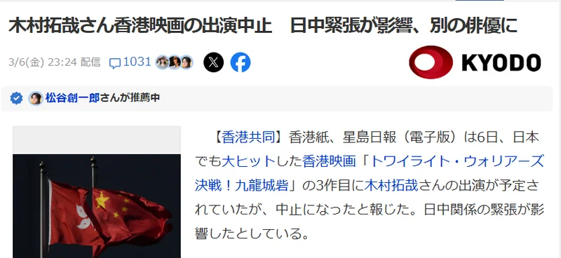 报道指出,木村拓哉的出演计划已经被取消,剧组将改由另一位演员加入。至于原因,媒体给出的解释是——当前紧张的中日关系可能产生了影响。