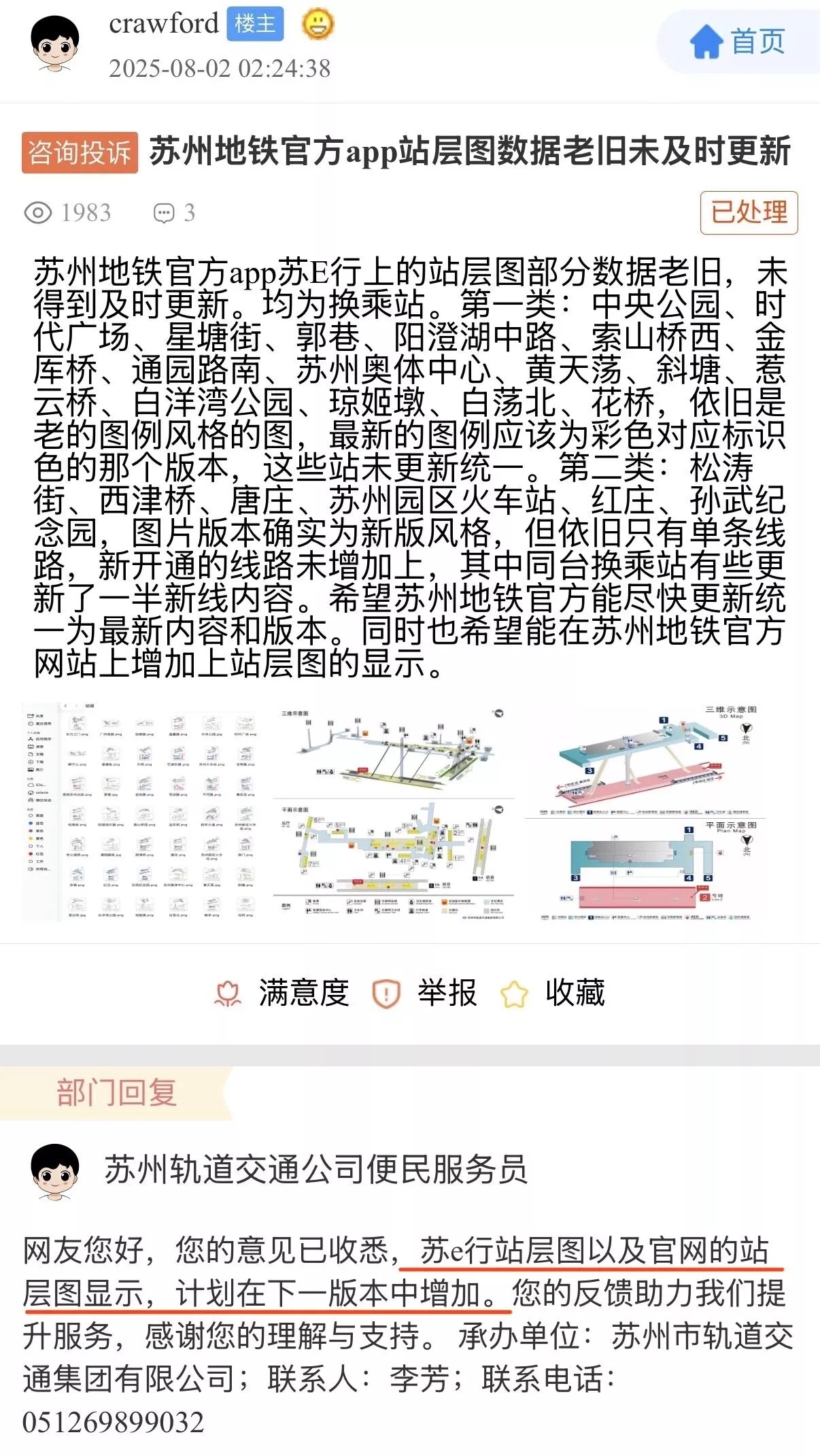 2025年08月,我发现苏州地铁官方APP“苏e行”站层图老旧,涉及到2024年新开通的 6、7、8号线的许多车站,站层图未及时得到更新。我甚至还贴心地将所有未更新的车站一一列举出来,以便苏州地铁工作人员核实,他们当时答应得好好的,称计划在下一版本中增加。