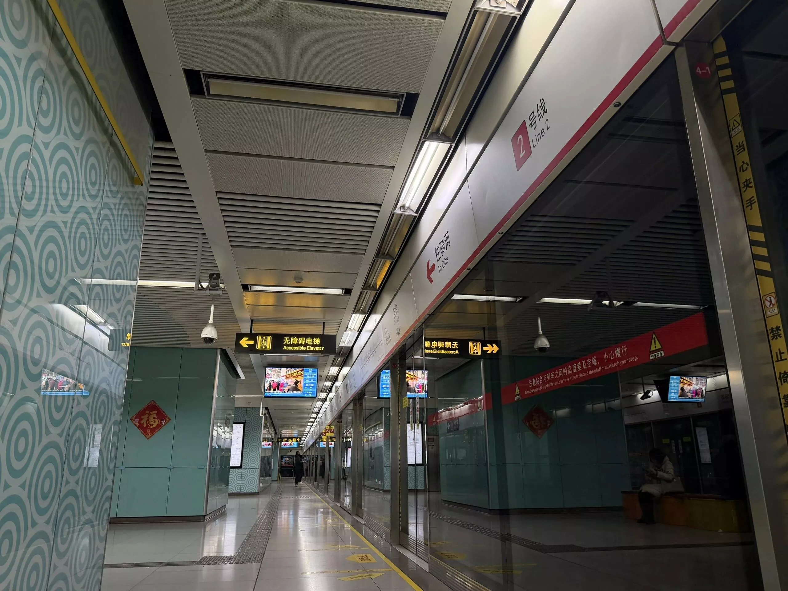 2号线友联站站台灯光昏暗,关闭的灯具数量远超开启数量,关灯比例已然过半,候车区域光线十分不足;可站内的星连驿站却灯火通明、亮度十足。