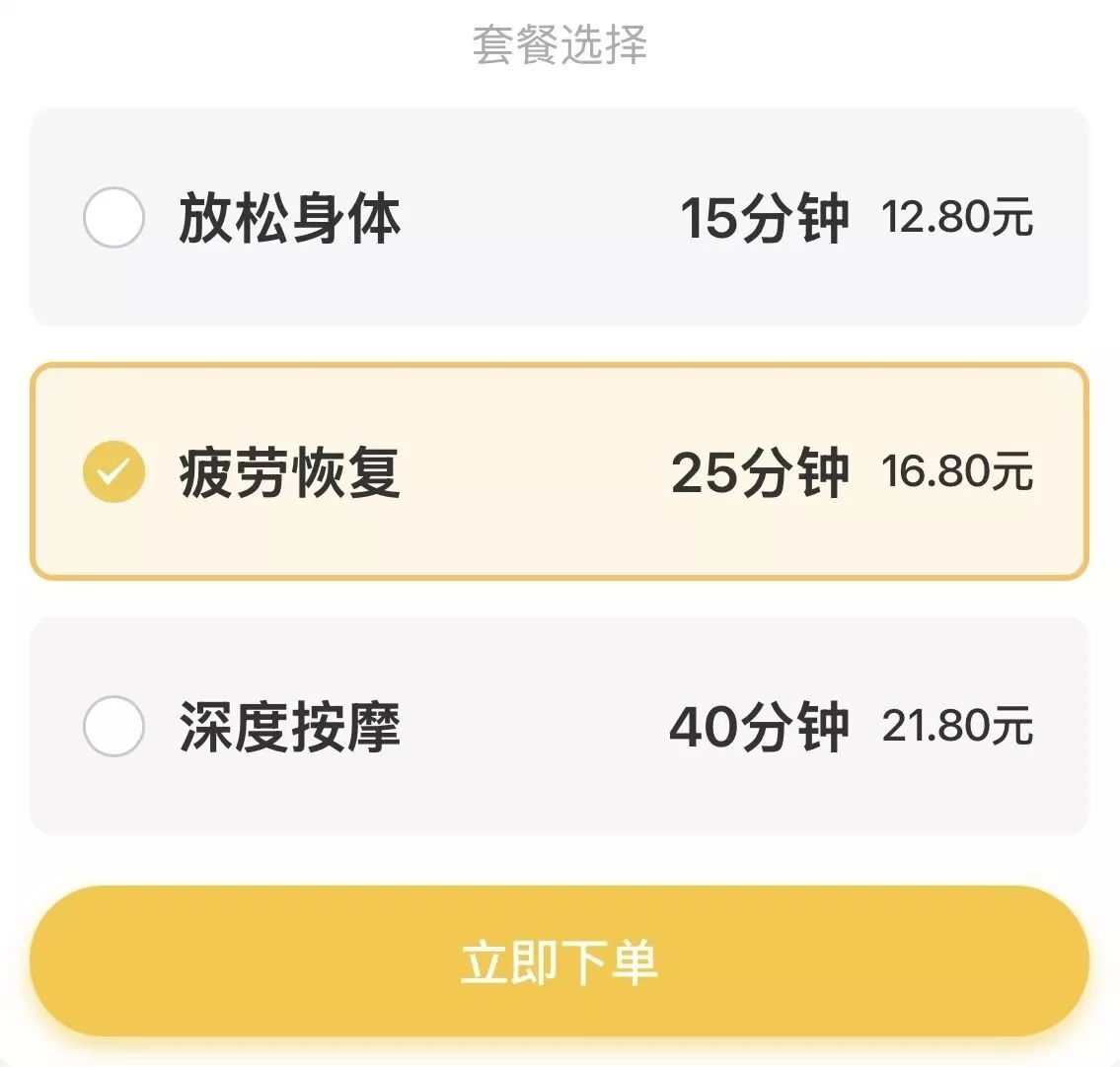 让我们来看一下按摩椅的收费标准,15分钟 12.8元,25分钟 16.8元,40分钟 21.8元。大家觉得这个价格是便宜还是贵呢?