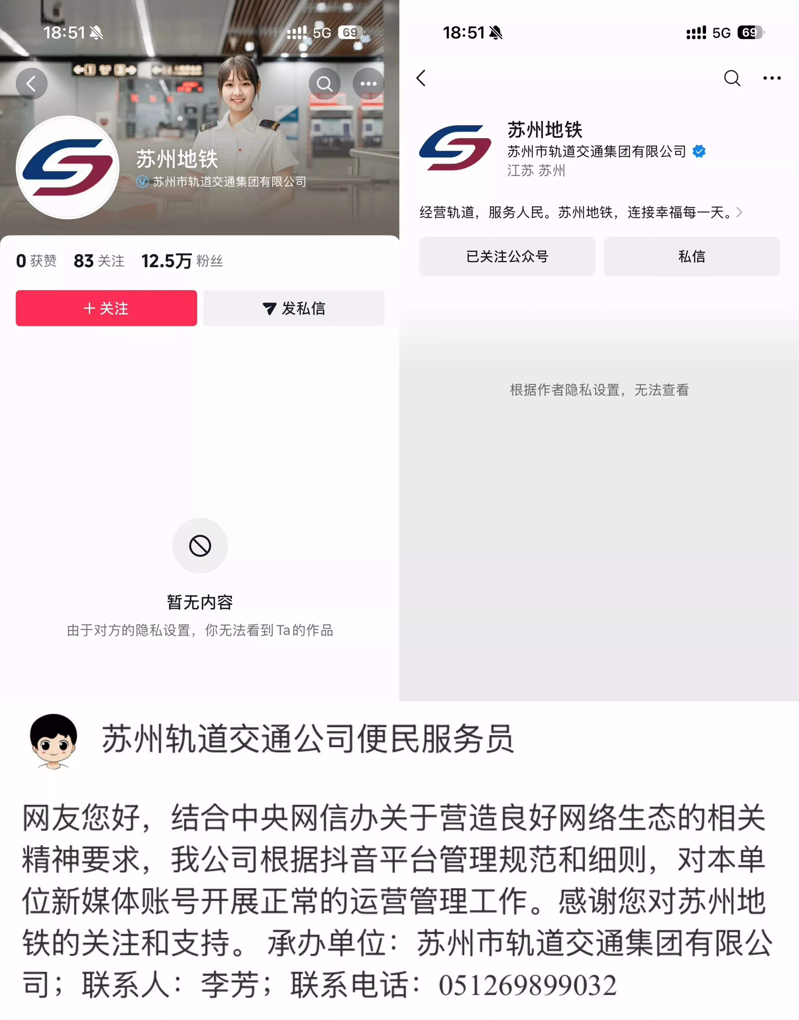 我身为热爱苏州及苏州地铁的热心市民,同时作为地铁博主,对细节更为敏感,常能发现苏州地铁的不足并提建议。像3/11号线贯通时标识导向自相矛盾,我持续反馈近两年。近期的站层图问题,我也不断强烈要求恢复更新,这既是为了方便市民出行,也是市民的权利、地铁应尽的义务。但苏州地铁综合管理办公室(数字化办公室)的某些工作人员不仅未重视,还因将我视作麻烦,利用媒体运营公权力将我账号全网拉黑,如此行径,实在令人唏嘘不已。