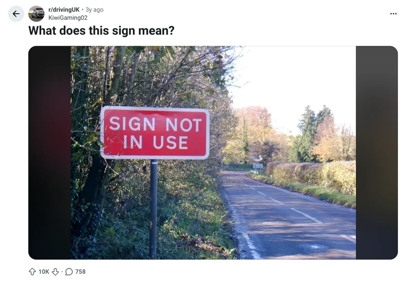 Reddit上关于这块路牌较大的一次讨论来自用户u/KiwiGaming02三年前发的提问帖。