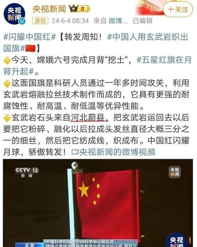 拿嫦娥六号在月背展示的那面旗子来说,它看着是一块红布,实际材料却硬得很。这可不是一般的化学纤维,而是由玄武岩制成的。