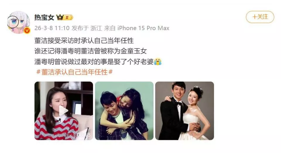 据网友3月8日爆料,演员董洁在一场访谈中的坦言,像一颗投入平静湖面的石子,瞬间激起了网友们的集体记忆。她首次用“任性不成熟”来定义自己在与潘粤明那场腥风血雨的离婚风波中的角色,并透露已不再阻止儿子顶顶与父亲见面。这番看似“和解”的姿态,却让一场尘封十四年的“离婚大战”再度被推至舆论的审判台前。