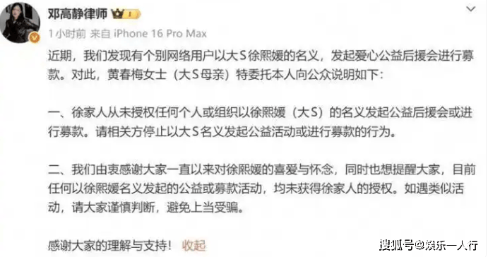 在这场遗产分配中,最失落的或许是S妈黄春梅。作为第二顺位继承人,在子女存在的情况下,她本就没有法定继承权。具俊晔的放弃操作,让她在法律上彻底“出局”。友人透露,S妈曾抱怨“大S赚钱就是为了养我”“现在一毛钱都分不到”。2026年2月27日,在马筱梅产子仅四天后,S妈正式委托上海德禾翰通律师事务所的邓高静律师,发布了一份严正声明。