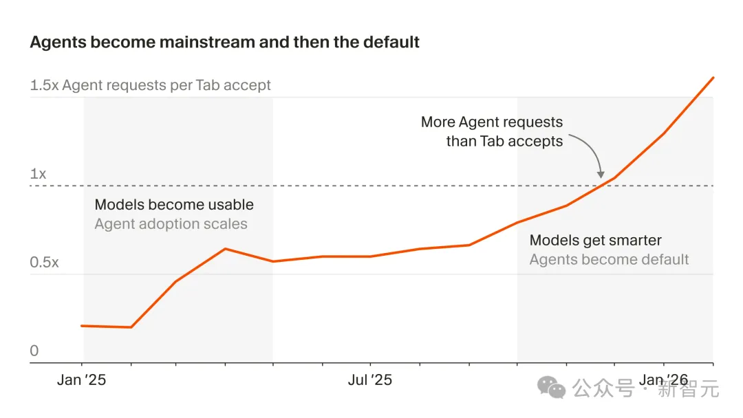 2025年3月,Cursor的Tab用户数量大约是智能体用户的2.5倍。现在情况已经反转,智能体用户数量是Tab用户的2倍。