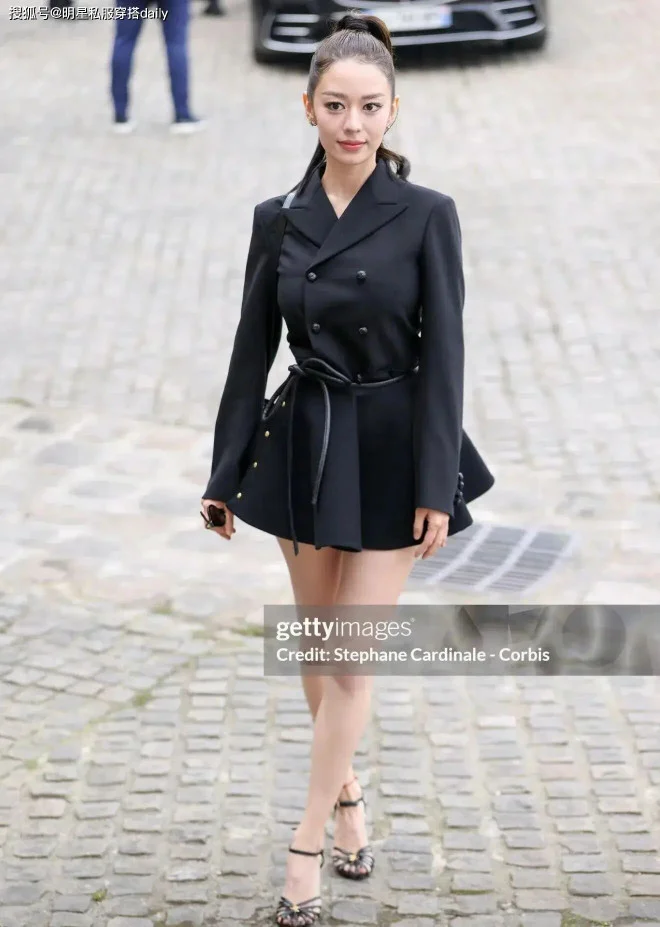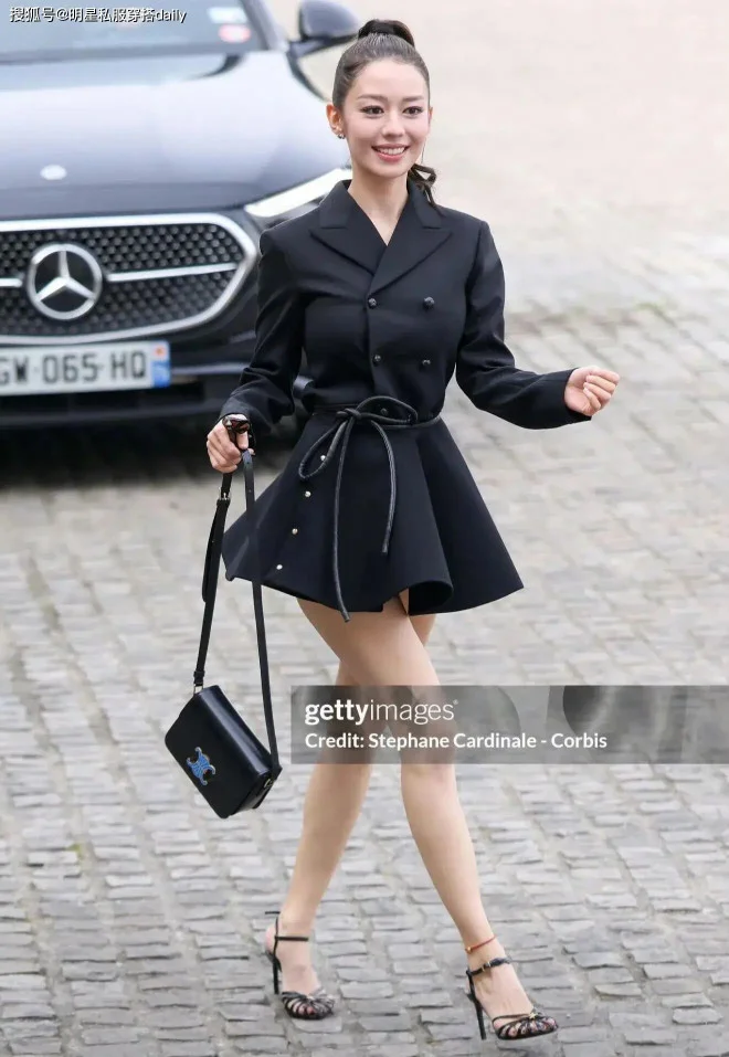 如果说红色热情似火,那么黑色短连衣裙则知性大气!这款长袖西装连衣裙搭配了一根腰带后,展现出吉娜的小蛮腰!!显白显气质!