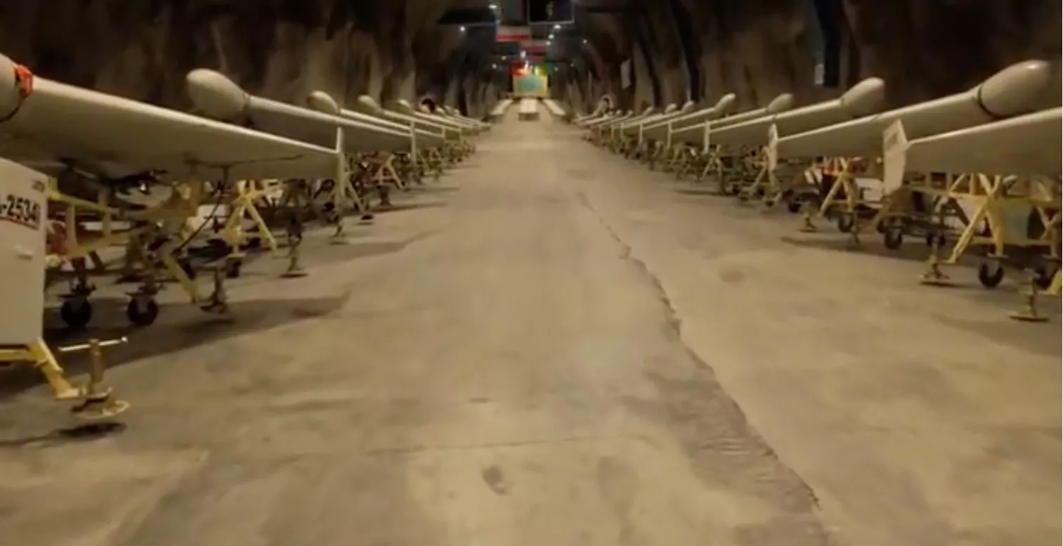 2026年3月5日,美国与以色列向伊朗发动的大规模袭击进入第五日之际,伊朗官方媒体法斯通讯社(Fars News Agency)近日发布一条影片,片中可看见成排的无人机存放在地下隧道中,其后被安装在火箭发射器上,以及它们近日以高速击中海湾国家民用设施的片段。(伊朗法斯通讯社)