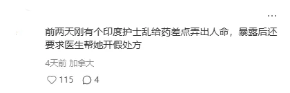 更让人后怕的是护理环节的严重失误。有网友爆料:“前两天刚有个印度护士乱给药差点弄出人命,暴露后还要求医生帮她开假处方。”