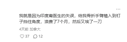 有网友的经历堪称惨痛:“我就是因为印度裔医生的失误,给我骨折手臂植入的钉子挡住了角度,浪费了 7 个月,然后又挨了一刀。”