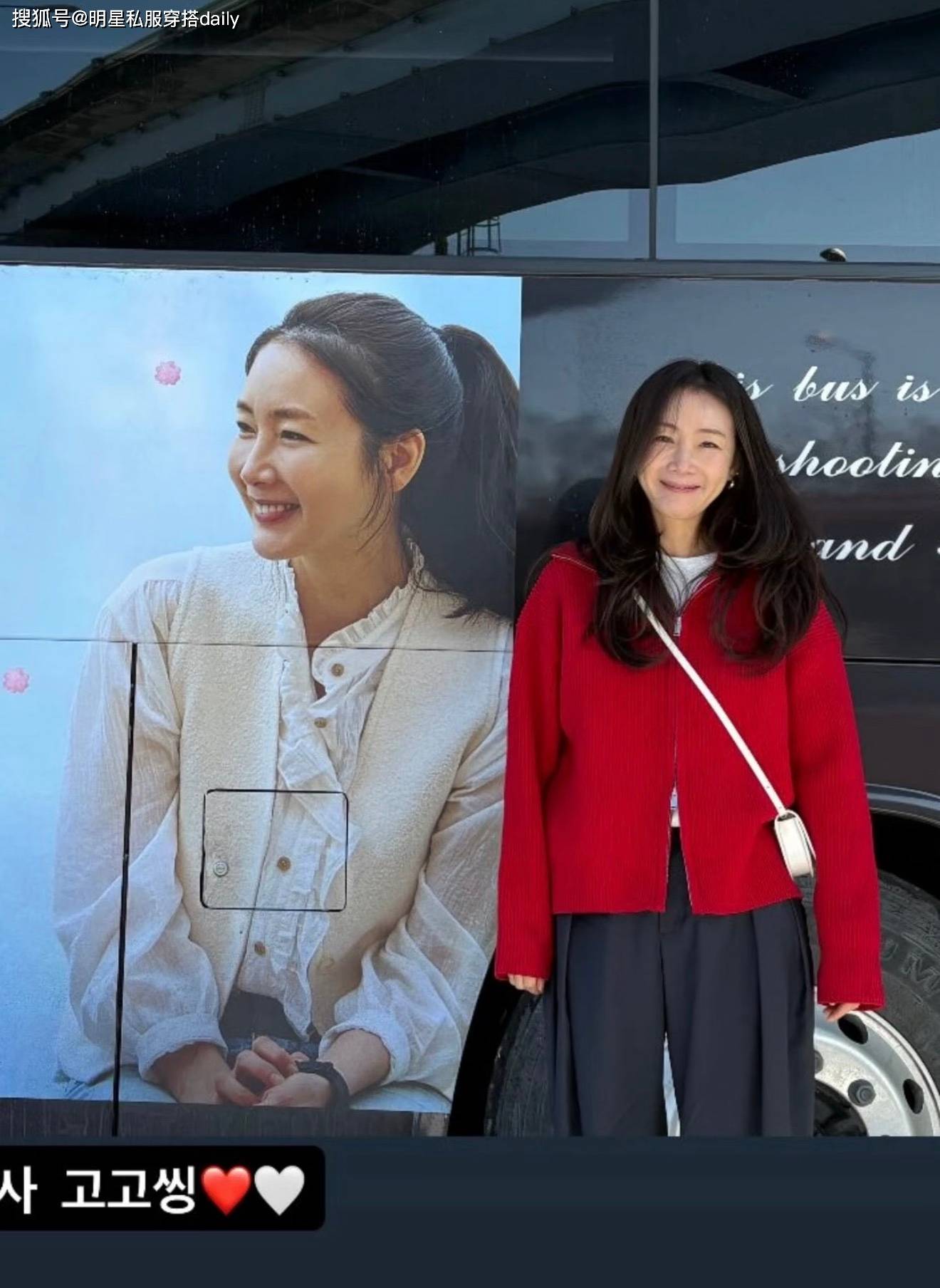 红色针织开衫是具有节日氛围的单品,但日常内搭白色T恤也很日常,尤其是像崔智友这样下半身搭配灰色阔腿裤,尽显知性大方!