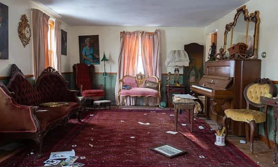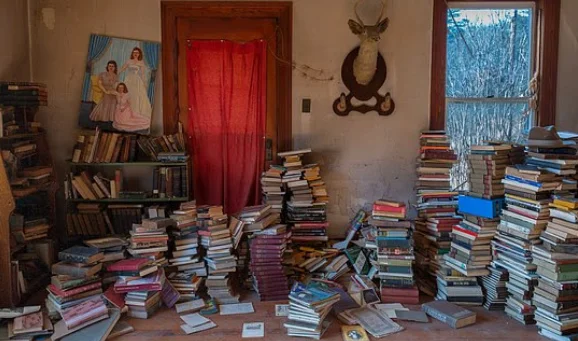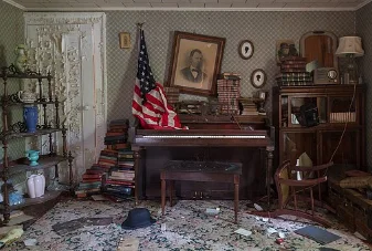 但在屋后的一间房里,却保留着一个奇特场景:一架老旧的立式钢琴,上面披着巨大的美国国旗,四周堆满书籍。地毯上散落着纸张和破碎的花瓶,而墙上的人物画像仍然静静注视着房间。