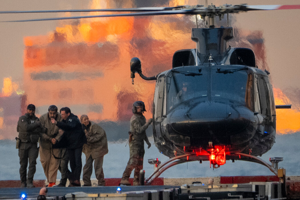 1月,委内瑞拉前领导人尼古拉斯・马杜罗和他的妻子西莉亚・弗洛雷斯被押下直升机,前往曼哈顿的联邦法院。 Vincent Alban/The New York Times