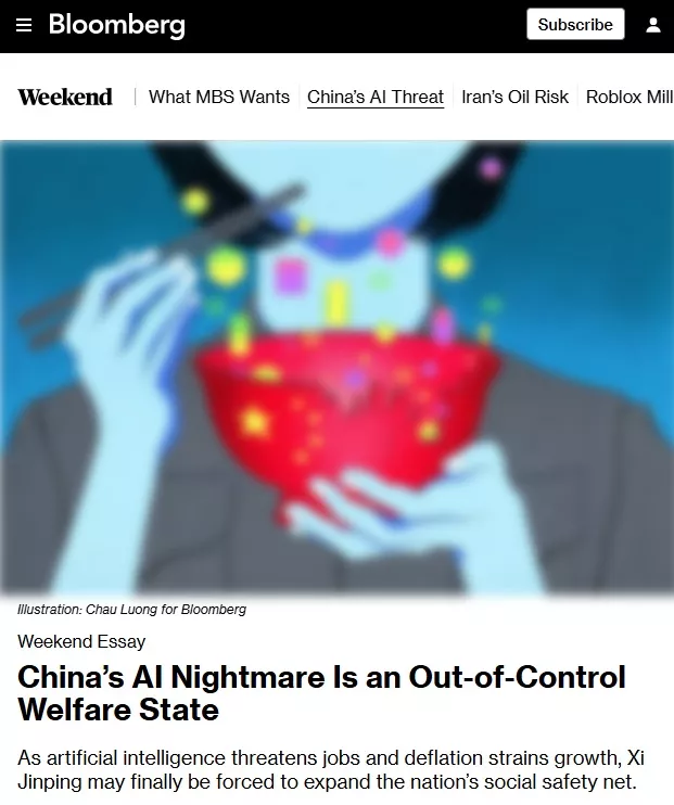 彭博的分析认为,随着人工智能威胁就业 、 通缩压力拖累经济增长,习近平可能最终被迫扩大中国的社会保障体系 。