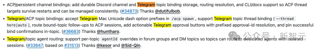 Discord端修复了断连后无法恢复的死机问题,优化了频道解析和机器人心跳检测。Telegram端新增了主题级别(Topic)的智能体路由隔离——这意味着你可以在同一个Telegram群组的不同主题里,分别运行不同的AI智能体,互不干扰。