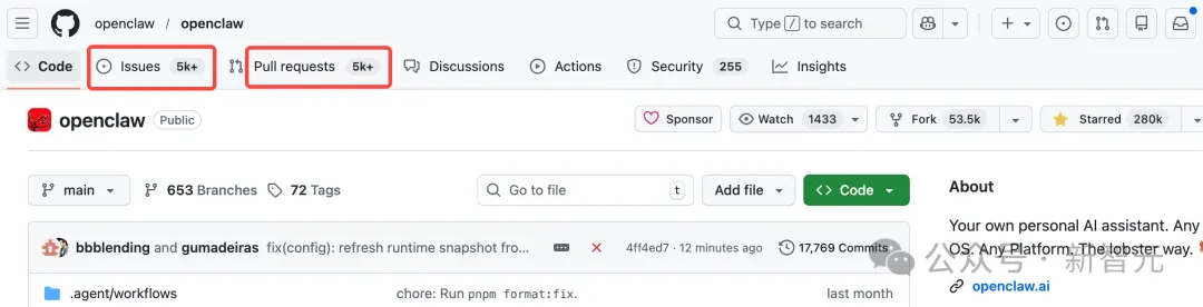 顺带一提,OpenClaw不仅Star数狂飙冲向3w+,而且issues和pr数量也是冠绝全球。