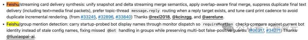 渠道层面,覆盖了Telegram草稿流重复、Discord断连死机、Slack消息路由、飞书Webhook兼容性、WhatsApp自聊天前缀注入、iOS/macOS端的各种边界情况。