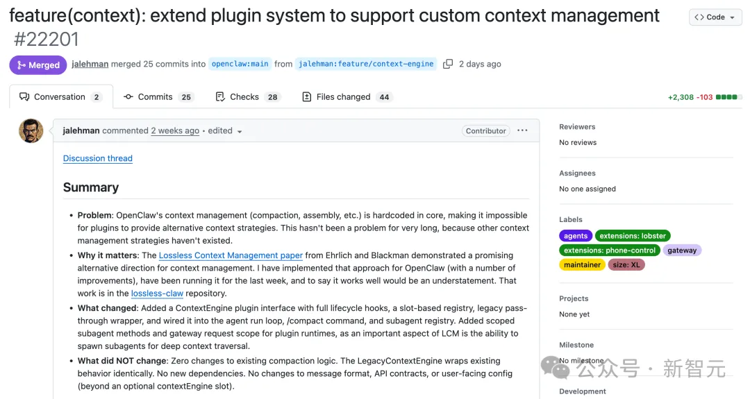 翻译成人话:开发者现在可以在不修改OpenClaw核心代码的情况下,完全自定义上下文的处理逻辑。你想用RAG?可以。想做激进压缩?随意。想让不同子任务拥有隔离的记忆空间?接口都给你准备好了。