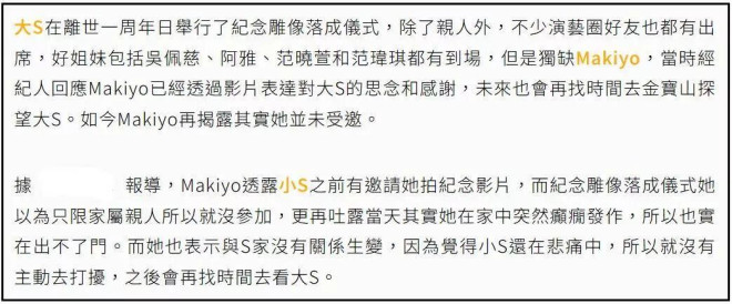 最近台媒一系列报道让外界再次意识到,大S的离世改变了太多人的生活,没有了大S的帮忙,她的好友Makiyo愈发沦落,险些带着儿子跌入斩杀线。