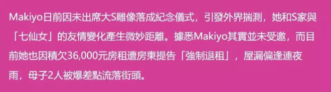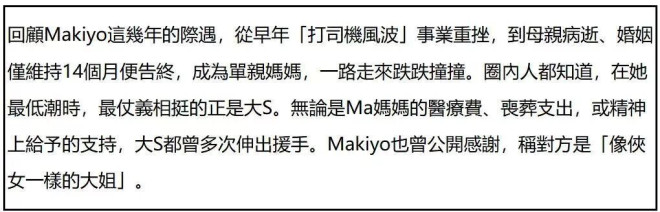 要知道当年Makiyo妈妈生病,医药费都是大S给的,Makiyo妈妈去世,丧葬费都是大S出的,如今没了大S的帮忙,Makiyo就孤立无援了。