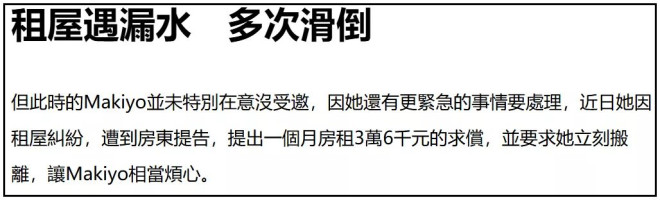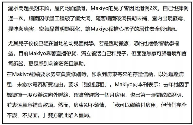 台媒曝光了Makiyo租屋现状,长期漏水、墙面破洞、屋子发霉,还有异味和虫害。