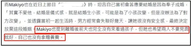 从台媒报道细节看,Makiyo又做了一个错误选择,单亲妈妈生活并不容易,她更没有学会如何做妈妈,从始至终都没有承担起应尽的责任,难怪网友会直言她不该轻率生子。